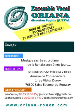 Vous pouvez nous retrouver pour une ou deux séances d'essai le lundi de 19h30 à 21h30 à l'annexe du Conservatoire de St-Etienne-du-Rouvray, rue Victor Duruy.